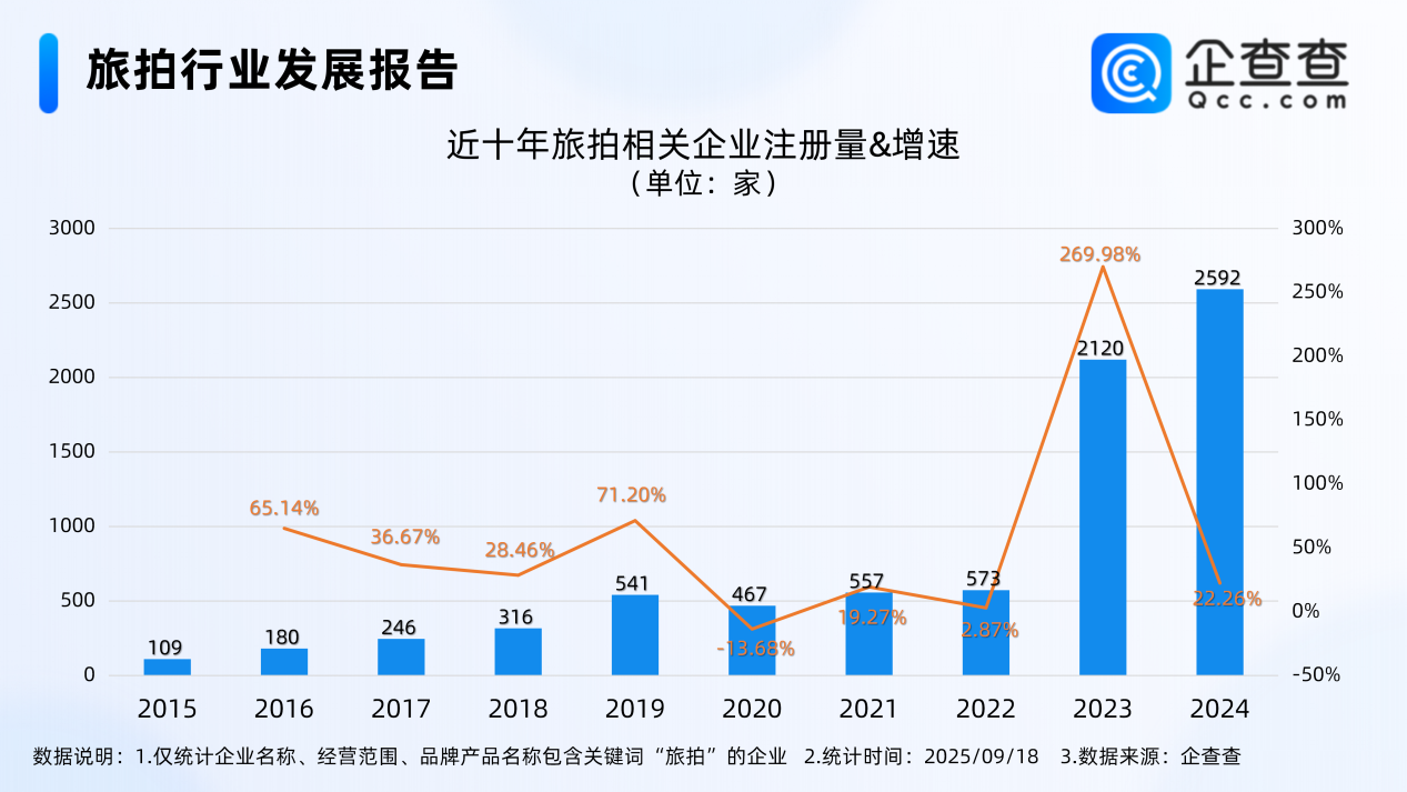 企查查数据显示,国内现存6445家旅拍相关企业。近十年相关企业注册量呈整体显着增长态势,2023年全年注册2120家相关企业,同比增长269.98%,达近十年注册量增速峰值。2024年全年注册2592家相关企业,同比增长22.26%,达近十年注册量峰值。截至目前,今年已注册1334家。