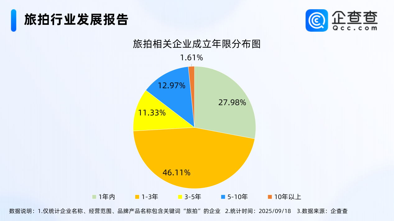 企查查数据显示,从经营时间来看,旅拍相关企业多成立于近三年,其中成立年限在1-3年的相关企业最多,占比46.11%。其次,成立年限在1年内的相关企业占比27.98%。