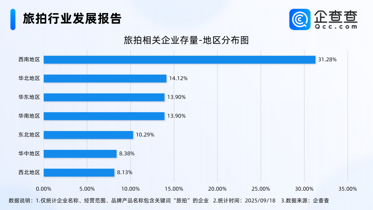 企查查数据显示,从地区分布来看,旅拍相关企业主要集中分布在西南地区,占比达31.28%。其次,分布在华北地区、华东地区的相关企业分别占比14.12%、13.90%。