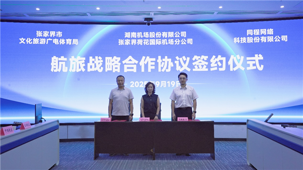 9月19日,同程旅行与张家界市文旅广体局、张家界荷花国际机场举行了航旅战略合作签约仪式,张家界市文旅广体局副局长田洪曼,张家界荷花国际机场党委委员、副总经理贺超,同程旅行出行事业群华南区总经理张磊等三方代表出席了签约仪式。此次合作协议签署后,同程旅行将与张家界市文旅广体局、张家界荷花国际机场共同探索新时期航旅融合发展之路,携手共建张家界“互联网+航空+文旅产业”融合发展新模式。