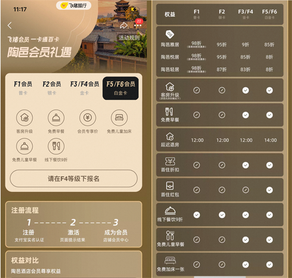 除了飞猪的高等级会员,飞猪F3、F4会员也可获得陶邑投宿会员的多项独家权益:直通金卡等级,领取免费早餐、房型升级、免费加床、免费儿童早餐、1.2倍品牌积分累计等多项权益。在此基础上,飞猪F5、F6会员还可获得延迟退房、1.5倍品牌积分累计等多项权益。