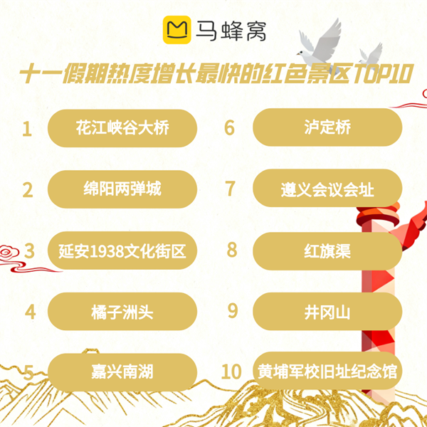 今年是中国人民抗日战争暨世界反法西斯战争胜利80周年,各大红色文化景区通过沉浸式展览、红色主题活动和历史故事讲解,吸引了众多游客前来缅怀先烈、了解历史。新近开通的“世界第一高桥”花江峡谷大桥吸引无数游客前来感受“基建狂魔”带来的震撼,带动花江村红色文化遗址热度暴涨超过1000%,成为十一假期热度涨幅最高的红色主题景区。绵阳两弹城、延安1938文化街区、橘子洲头、嘉兴南湖、泸定桥、遵义会议会址、红旗渠、井冈山、黄埔军校旧址纪念馆等红色景区紧随其后。