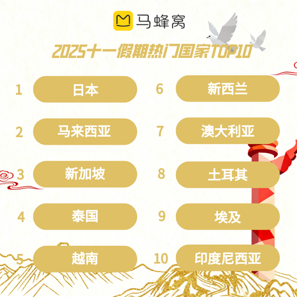 出境游同样在这个长假迎来高峰,日本、马来西亚、新加坡、泰国、越南、新西兰、澳大利亚、土耳其、埃及、印度尼西亚位列热门国家前十。马蜂窝此前推出的“AI旅行助手”APP,以及AI订餐厅、AI对话翻译成为畅游日本的实用帮手,十一期间使用量增长显着。