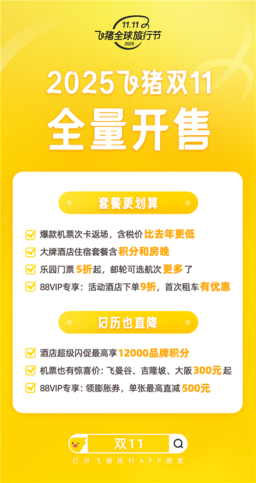 10月20日晚8点,2025年飞猪双11全球旅行节全量货品正式开售,预售商品尾款支付通道也同步开放,消费者可即买、即约、即出行。