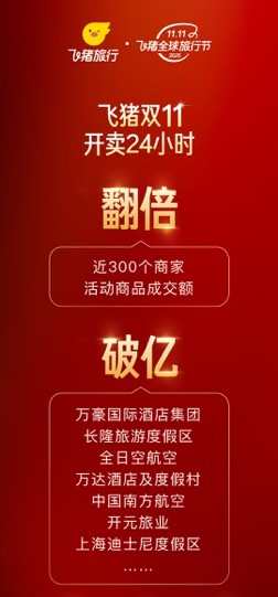 10月22日,据飞猪消息,双11开卖24小时,万豪国际酒店集团、长隆旅游度假区、全日空航空、万达酒店及度假村、中国南方航空、开元旅业、上海迪士尼度假区等品牌活动商品成交额纷纷破亿。近300个商家活动商品成交额较去年翻倍。出境游表现尤为亮眼,新加坡、意大利、瑞士、芬兰、阿联酋、埃及、挪威、摩洛哥、奥地利、丹麦等目的地活动商品成交额均已超过去年双11全程。
