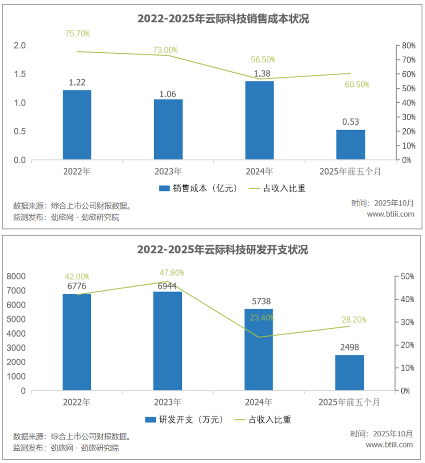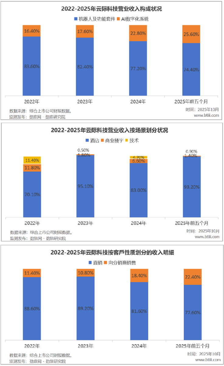 2025年前五个月主营业务中,机器人及功能套件及AI数字化系统营业收入占比分别为74.40%、25.60%。云际科技收入按场景分,酒店占93.20%、商业楼宇占1.40%、技术占0.90%。按客户性质划分,云际科技直销收入占77.60%、分销商销售收入占22.40%。