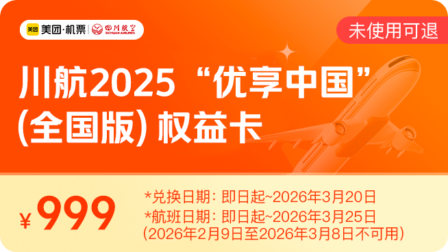 11月10日上午11时至11月14日12时,川航2025“优享中国(全国版)”权益卡在美团旅行开售,用户以999元购买后,可不限次数以每张199元的价格,在美团兑换川航实际承运的国内经济舱机票(不含港澳台地区航线)。