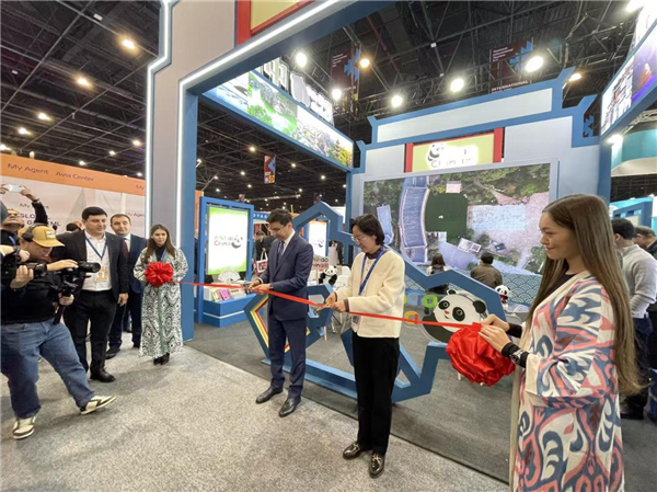 乌兹别克斯坦旅游委员会主席乌米德·沙迪耶夫与中国驻乌兹别克斯坦大使馆参赞薛莲共同为中国馆开馆剪彩。沙迪耶夫主席参观中国展馆,观看了文旅宣传视频,深入了解现场展示的中国各地优质文旅资源和富有创意的文创产品。