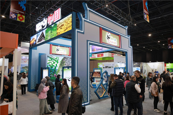 中国展馆以中式传统建筑为设计灵感,巧妙融合现代美学语言,生动诠释中华文明“守正创新、历久弥新”的精神气质。现场设置“你好!中国”主题打卡墙、憨态可掬的大熊猫玩偶互动区,展示黑龙江、山东、海南、贵州、宁夏、新疆等省(自治区)及延安、泉州、吐鲁番等地市的多语种旅游宣传视频和资料,全方位展现中国作为世界文化遗产大国和重要入境旅游目的地的独特魅力。
