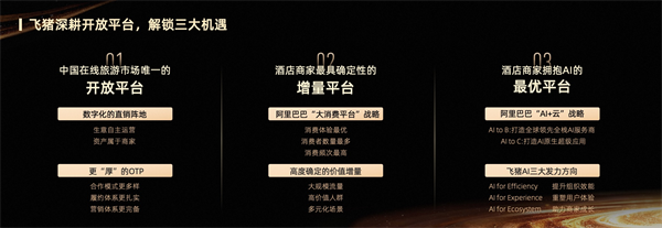 飞猪CEO庄卓然表示:“现在正是酒店商家深度拥抱飞猪的最佳时机”。他说,飞猪是中国在线旅游市场唯一的开放性服务履约平台,同时,在阿里巴巴的“大消费平台”和“AI+云科技平台”两大战略的加持下,飞猪也将成为酒店商家最具确定性的增量平台、拥抱AI的最优平台。