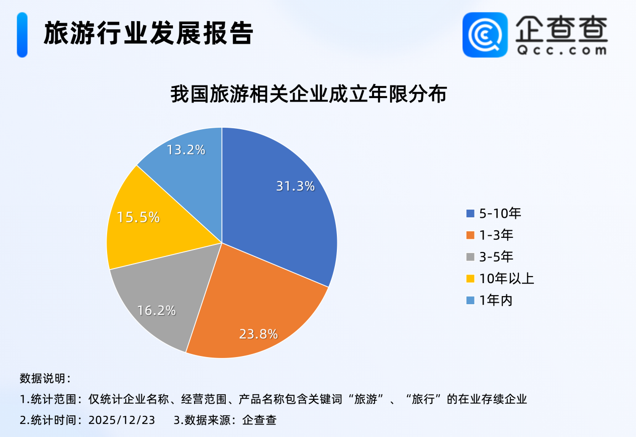 企查查数据显示,截至12月23日,我国现存234.4万家旅游相关企业,成立年限分布相对均匀,其中成立5至10年之间的企业最多,占比31.3%,其次是成立1至3年之间的企业,占比23.8%。