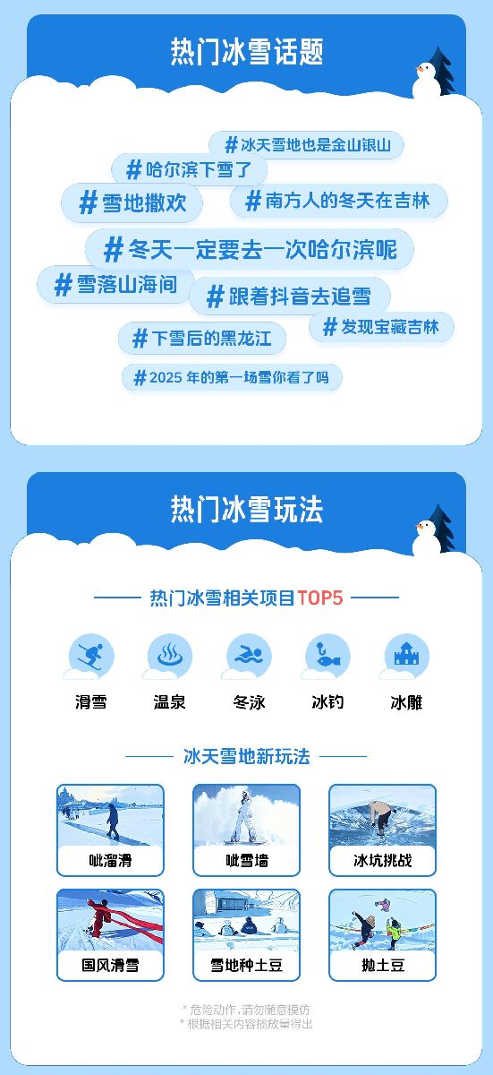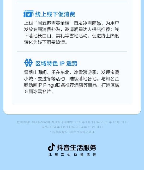 2025年11月起,抖音生活服务发起“冰雪季”活动,联合游玩、住宿、旅行社等19个品类商家,累计提供超5万种冰雪商品,通过百万爆品、线上线下促销、区域特色IP打造,激发各地冰雪消费热情。抖音生活服务“冰雪季”活动相关负责人介绍,活动不仅上线百万爆品,也为用户发放专属消费补贴。平台将持续通过内容种草、达人探店、特色IP联名,助力线下冰雪消费。