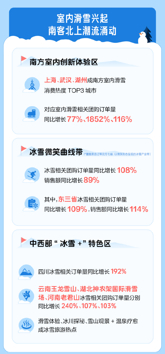 报告显示,室内滑雪兴起,南客北上潮流持续涌动。上海、武汉、湖州成南方室内滑雪消费热度TOP3城市,对应室内滑雪相关团购订单量分别同比增长77%、1852%、116%。东三省、京津冀、内蒙古和新疆形成的北方“微笑曲线”冰雪产业带团购订单量同比增长108%,从“尔滨”出圈后的“南客北上”潮流,持续激发北方冰雪经济活力。陕西、湖北、河南和四川为主的中西部“冰雪+”特色区也有较高热度。例如,四川冰雪相关团购订单量同比增长192%,云南玉龙雪山相关团购订单量同比增长超240%。