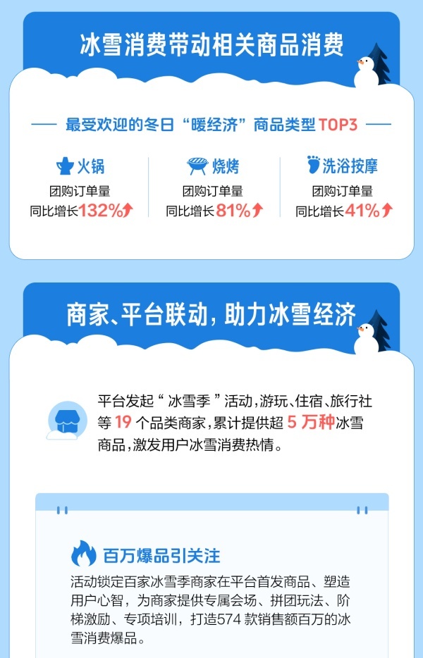 数据表明,亲子家庭和新生时代成冰雪消费主力军。从消费人群看,亲子家庭的冰雪相关团购订单量占比超55%。新生时代次之,相关团购订单量占比超17%。从消费趋势看,新生时代同比增长超65%,下单增速最快。活力银发、享乐单身、乐活情侣、亲子家庭等群体的冰雪消费,同比均有超30%的增速。此外,用户冰雪消费热情高涨,进一步带动火锅、烧烤、洗浴按摩等“暖经济”消费,带动线下消费热潮持续升温。