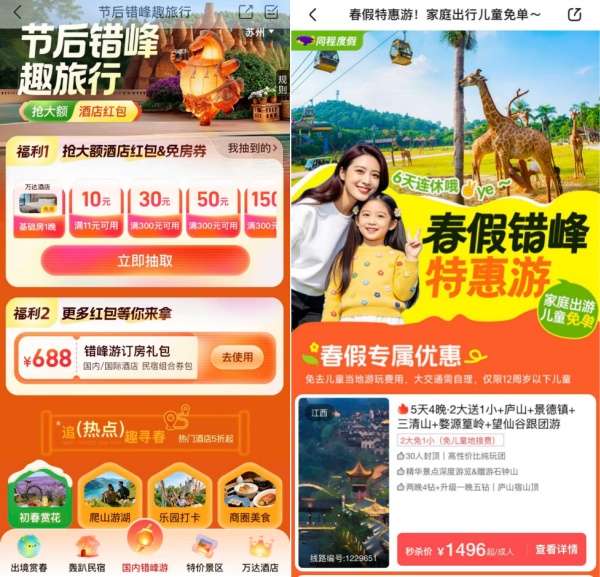 为了满足大众错峰旅游的需求,同程旅行近期上线了覆盖国内和出境住宿、度假等多品类的错峰游专题活动。在同程旅行APP酒店频道内的“节后错峰趣旅行”活动中,消费者可领取价值688元的“错峰游订房礼包”,以及不同金额的酒店红包和免房券。此外,同程旅行还面向12周岁以下儿童的家庭,推出了“春假错峰特惠游,家庭出游儿童免单”活动,进一步提升了家庭春季错峰游的性价比。