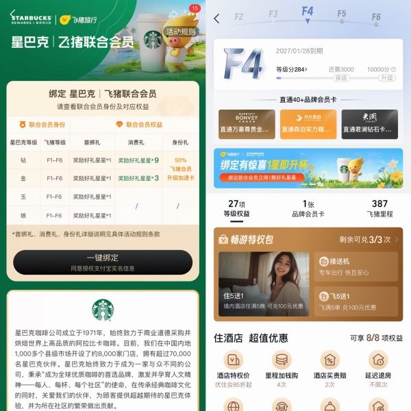 4月14日,星巴克中国与飞猪推出联合会员。即日起,星巴克中国银星、玉星、金星、钻星会员可依据等级,直通相应的飞猪F2至F4会员等级,并享有飞猪里程加速累计、消费返星巴克奖励好礼星星等权益。其中,飞猪里程可用于预订酒店时抵扣房费或兑换出行权益,星巴克奖励好礼星星则可在星巴克兑换免费饮品、折扣券、升杯等服务。